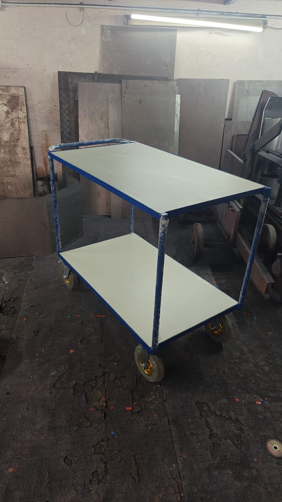 Heavy Duty Industrial Platform Trolley :: - Heavy Duty 800-1000 Kilos load carrying Platform Truck - MS 2mm chequered sheet fabrication with angle frame and reinforcement - Fitted with Rubber/Nylon/PU Caster wheels with stoppers - Fully customizable as per requirement - Can be made in SS and MS
